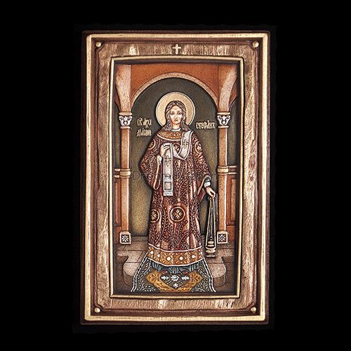 Красива, ръчно изработена икона на Свети Стефан. Стилно изображение на Светеца, стоящ под купол на храм. В елегантна рамка със златисти детайли. Подходящ избор за подарък за имен ден, рожден ден и всеки друг повод.