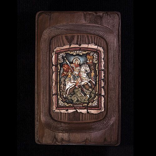 Красиво, детайно изображение на Св. Георги Победоносец, поставено върху нестандартната дървена основа.