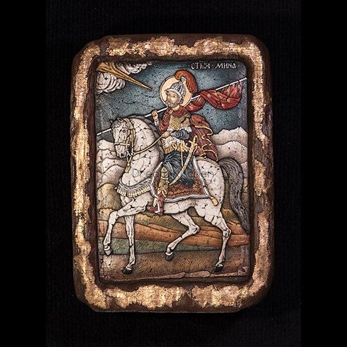 Класическо изображение на Св. Мина, осеяно с пукнатини и разположено в нестандартна дървена рамка със старо злато.