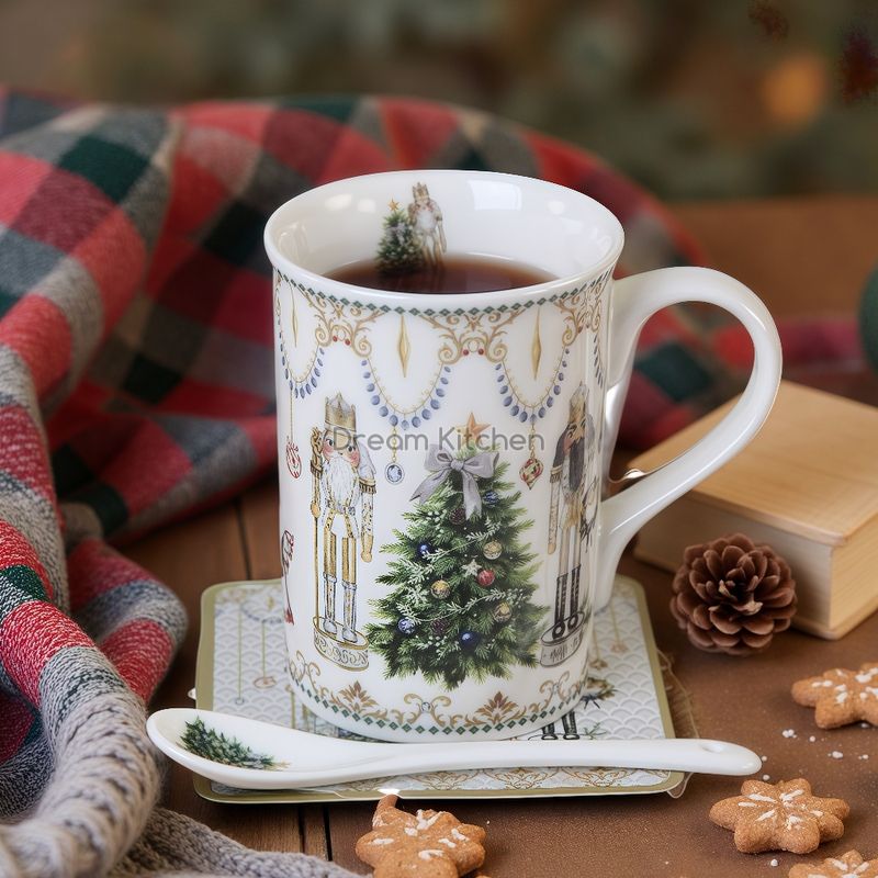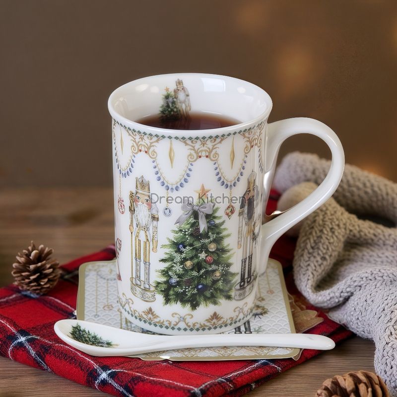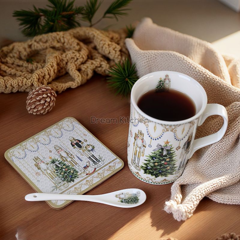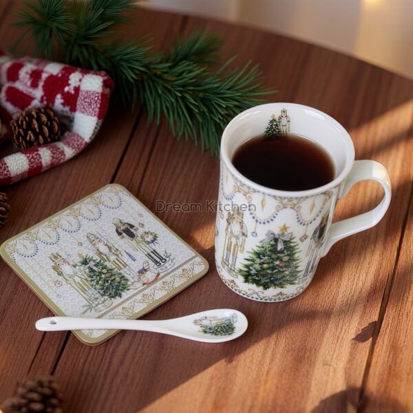 Коледна чаша с лъжичка и подложка за чаша от серията "Златни елементи" с ефектна коледна декорация. Предлага се в цветна кутия.