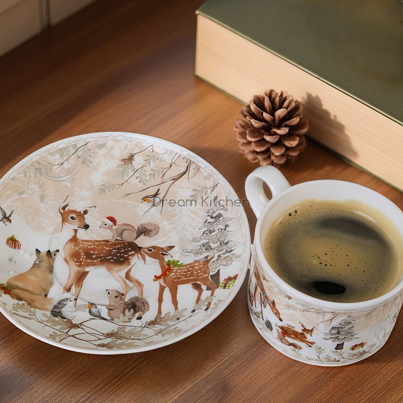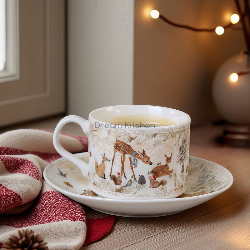 Коледна чаша с чинийка от серията "Горска приказка" с ефектна коледна декорация. Предлага се в цветна кутия.