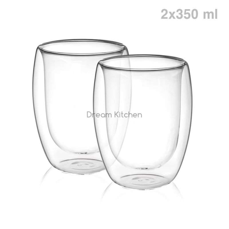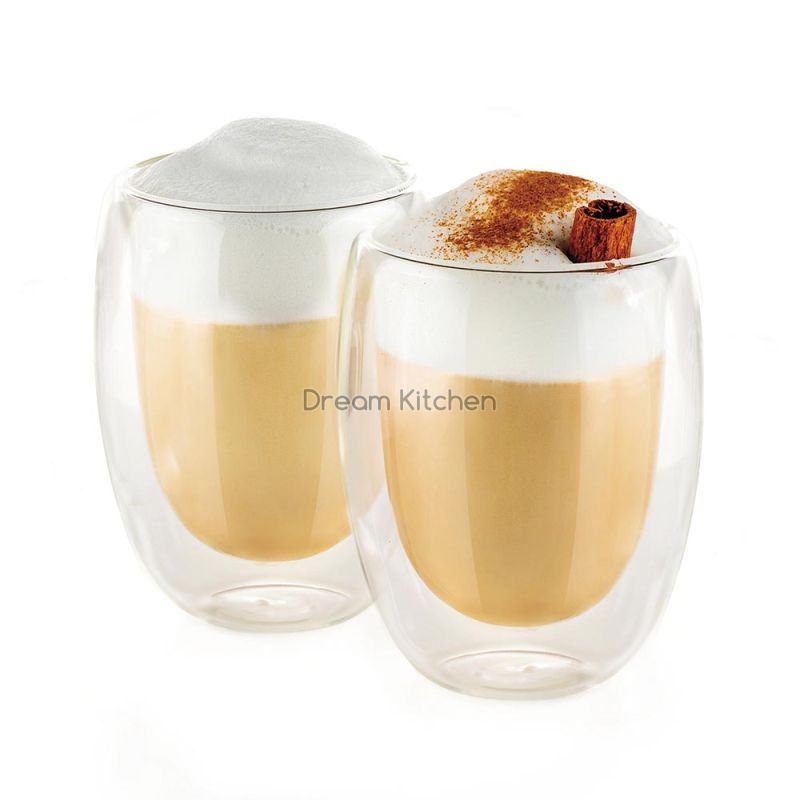 Комплектът съдържа: чаши за капучино и лате макиато без дръжка с вместимост 350ml - 2 броя размери на чашата: Ø8.5xH11.6cm Изработена от боросиликатно стъкло, което издържа на температури в диапазон 0 - 300 °С Двойните стени гарантират запазване на температурата на напитката за по-дълго време като в същото време предпазва пръстите ви от опарване при хващане Не се препоръчва за почистване в съдомиялна машина Подходяща за ползване в микровълнова печка