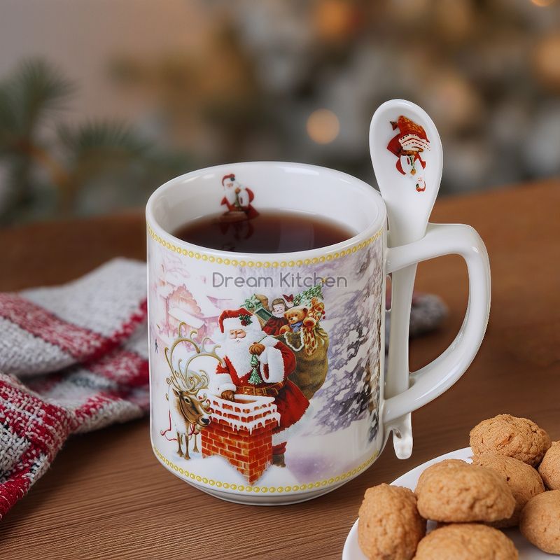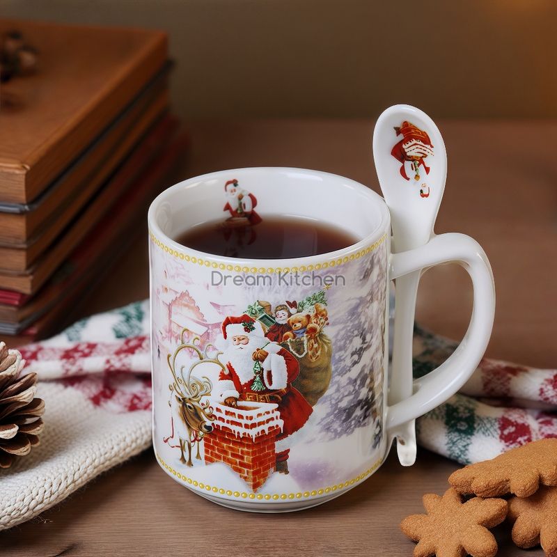 Коледна чаша с лъжичка от серията "Дядо Коледа" с ефектна коледна декорация. Предлага се в цветна кутия.