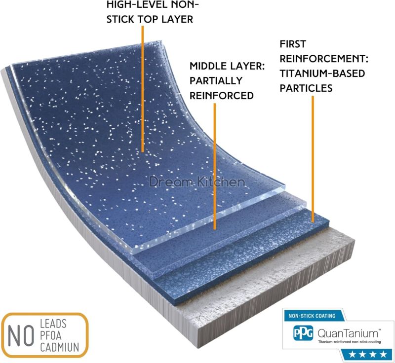 Основният акцент е върху покритието Quantanium®, подсилено с титаниеви частици. То предлага много висока устойчивост на надраскване, дълъг живот и отлични незалепващи свойства. Покритието е без PFOA, което го прави безопасно и подходящо за здравословно готвене с по-малко мазнина.